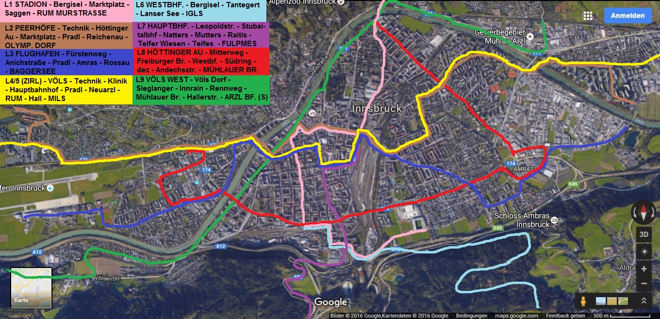 Zu überlegen wäre dann sogar überhaupt eine spätere Weiterführung Richtung Westen mit Verknüpfung an einen neuen Westast der L3 ri. Flughafen sowie ein Grundstein für eine spätere Südringtram (nennen wir sie proforma einmal L8 ), gleichzeitig bereits mit vorgesorgter Umsteigemöglichkeit in eine Tram die über den südlichen Innrain fährt und Sieglanger (wo bekanntlich Wohnbau stattfinden soll) anbindet.