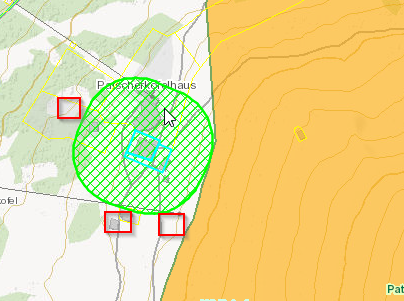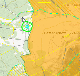 Nimmt man die Grenzen des Landschaftsschutzgebiets Patscherkofel-Zirmberg aus Tiris und puffert 70m um die Schutzhüttenparzelle ergibt sich folgende Aussage: