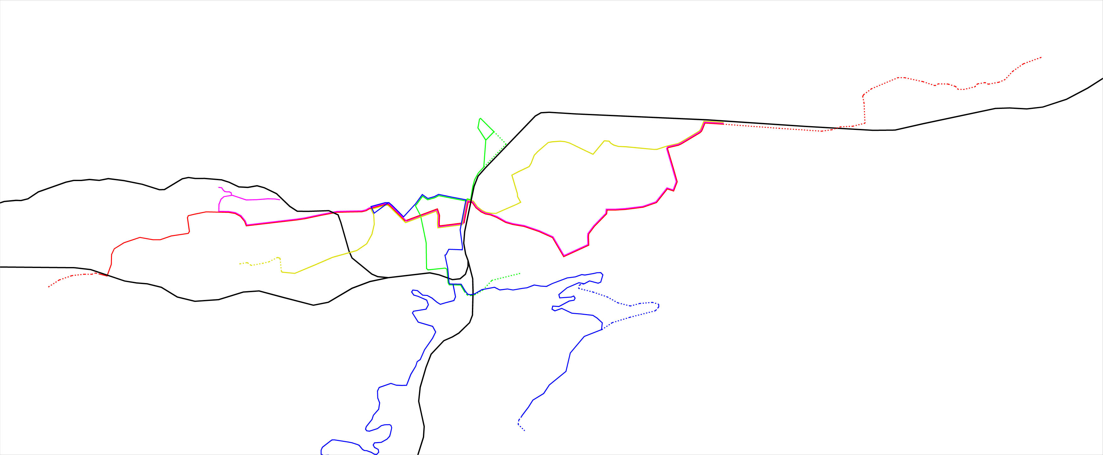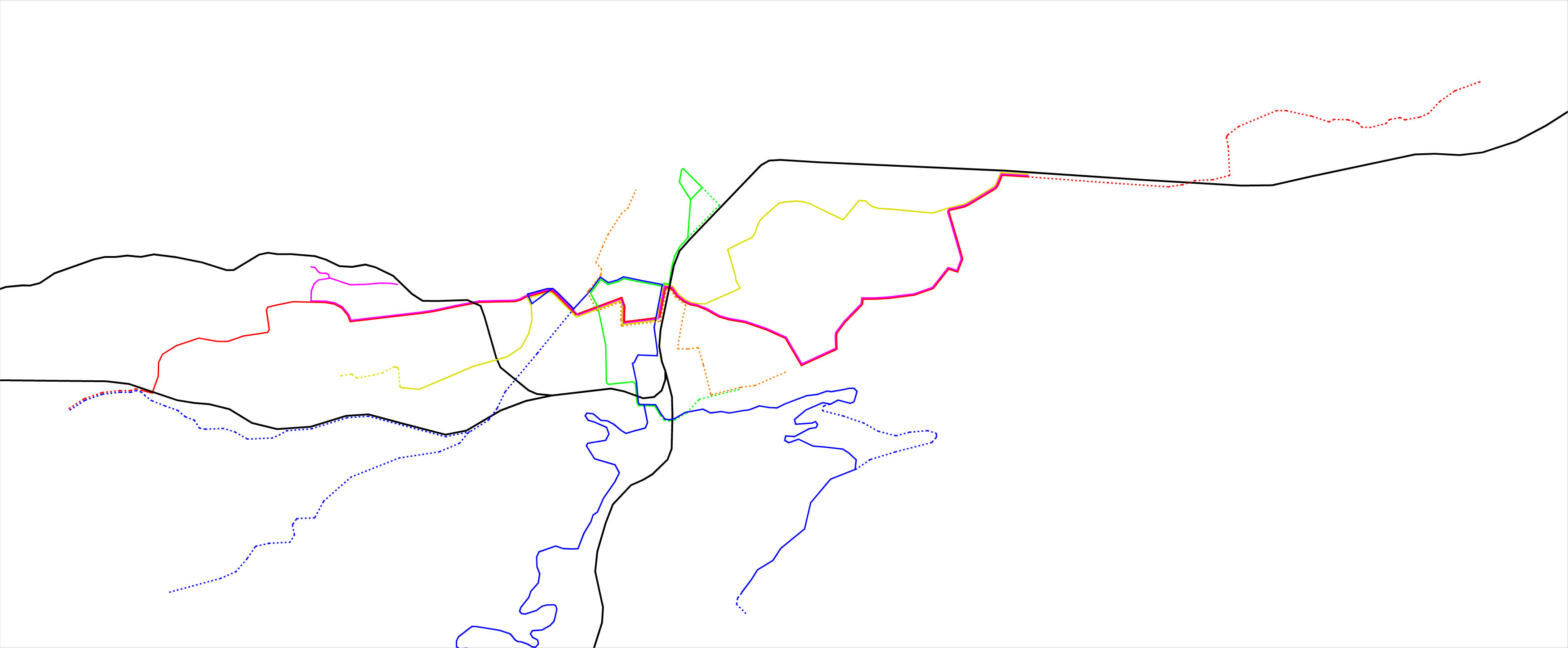 ... und hier noch eine Variante mit weiteren (sehr sehr langfristigen ) Ausbauten. Hier würden zusätzlich die Linien 1 und 5 (orange) ein X ergeben...