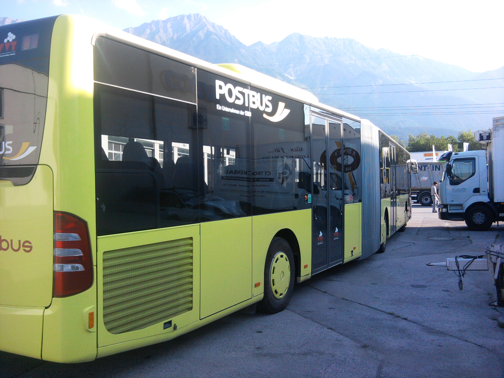 Ach ja die ganze Kurse die nach Telfs fahren sind auch gemischt. Was fahren kann, fährt. Beim Abstellplatz stehen 12m Busse, 15m Citaros, die O405 Gelenkbusse und auch noch die Busse von TyrolTours.