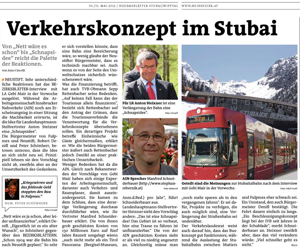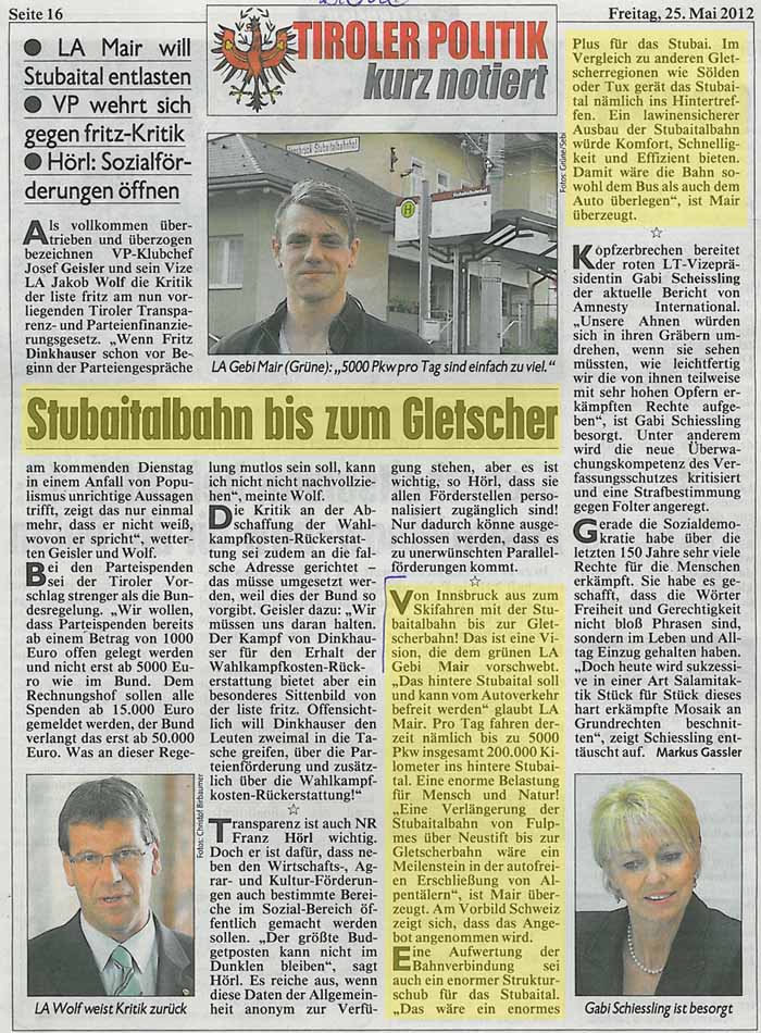 Eine „Schnapsidee“ sei der Ausbau der Stubaitalbahn bis zum Stubaier Gletscher, erklärte Landeshauptmannstellvertreter Anton Steixner (VP). Der GRÜNE Landtagsabgeordnete Gebi Mair hatte gefordert, genau darüber nachzudenken. „Den Straßenbau hält Anton Steixner erstaunlicherweise nie für eine Schnaps- sondern für eine glorreiche Idee. Deshalb werden im Straßenbau allein vom Land Tirol auch heuer wieder an die 150 Millionen Euro asphaltiert“, rechnet Gebi Mair vor. “Aber für einen nachhaltigen Tourismus und für die Umwelt im Tal ist eine bessere öffentliche Verkehrs-Infrastruktur unerlässlich“, so Mair weiter.