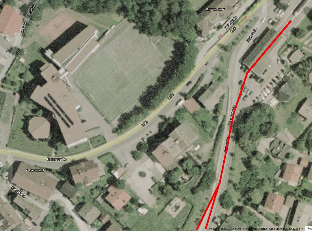 Ich hab mir mal den Spass gemacht, eine potentielle Trassenführung (von Fulpmes bis Milders) ins Luftbild einzuzeichnen. Losgehen würde es am bisherigen Bahnhof in Fulpmes, man würde die hintere Wand der Remise durchstossen.