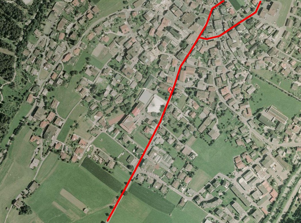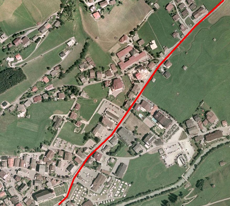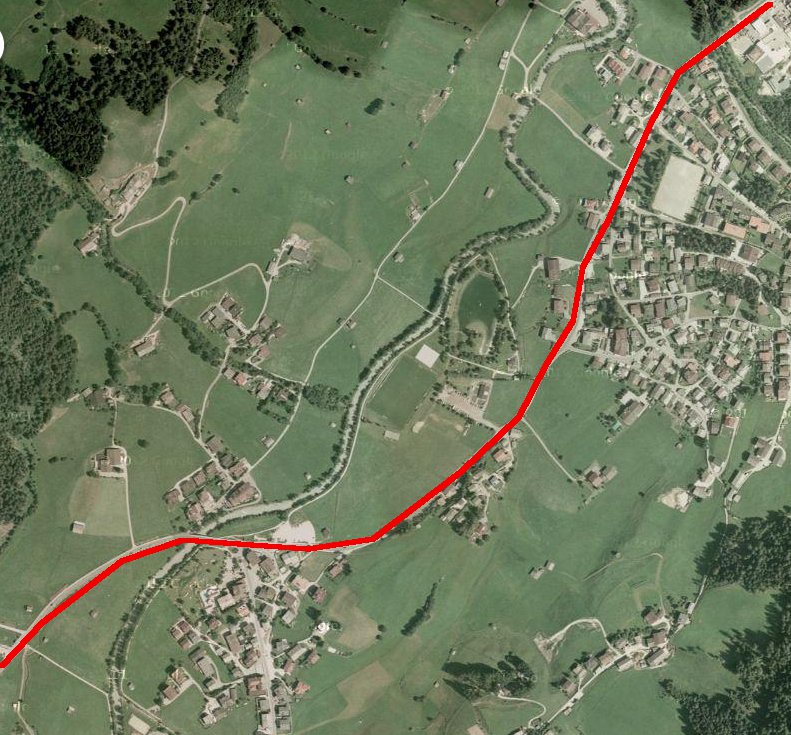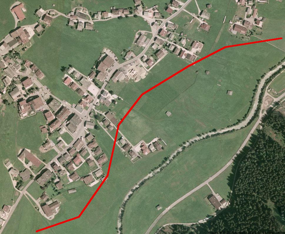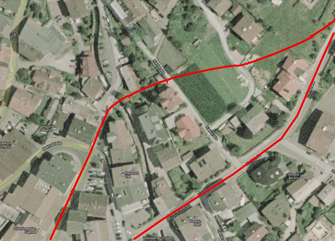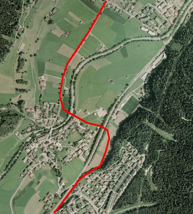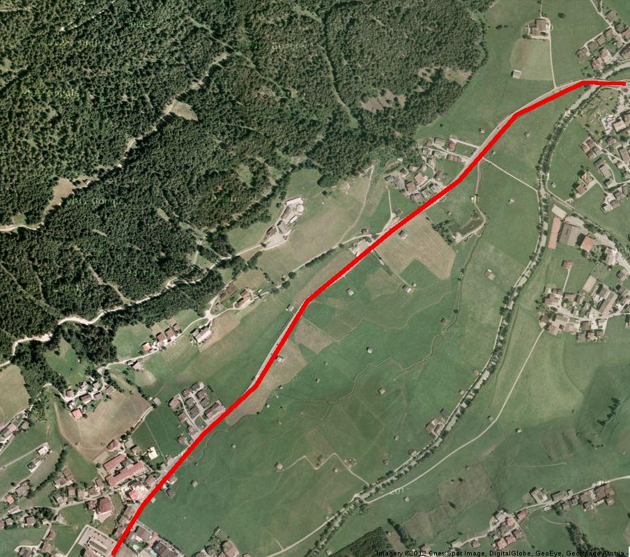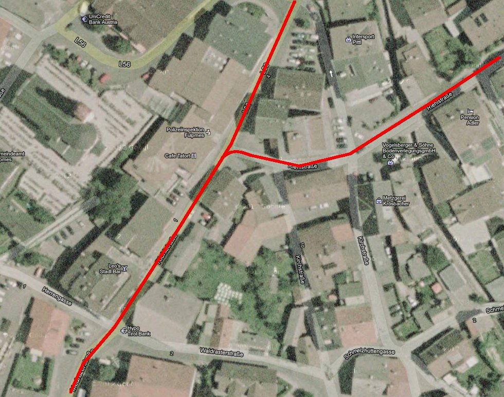 Dann kommt gleich der wohl diffizilste Teil der ganzen Strecke, nämlich die Durchquerung von Fulpmes. Da sehe ich zwei Varianten: Erstens, die Riehlstrasse bald nach oben hin verlassen, quer über eine unverbaute Wiese zwischen den Häusern, und dann durch eine Lücke zwischen den Häusern hindurch im flachen Winkel auf die Straße die im weiteren Verlauf geradeaus nach Medraz führt. Wenn das Luftbild nicht trügt, sollte da noch eine Lücke sein die breit genug für ein Tramgleis ist. Was das Luftbild nicht sagt ist, ob da gleichzeitig noch eine mehr oder weniger steile Böschung ist.