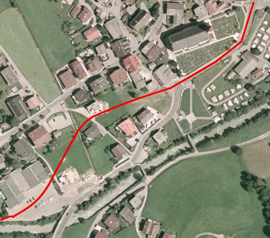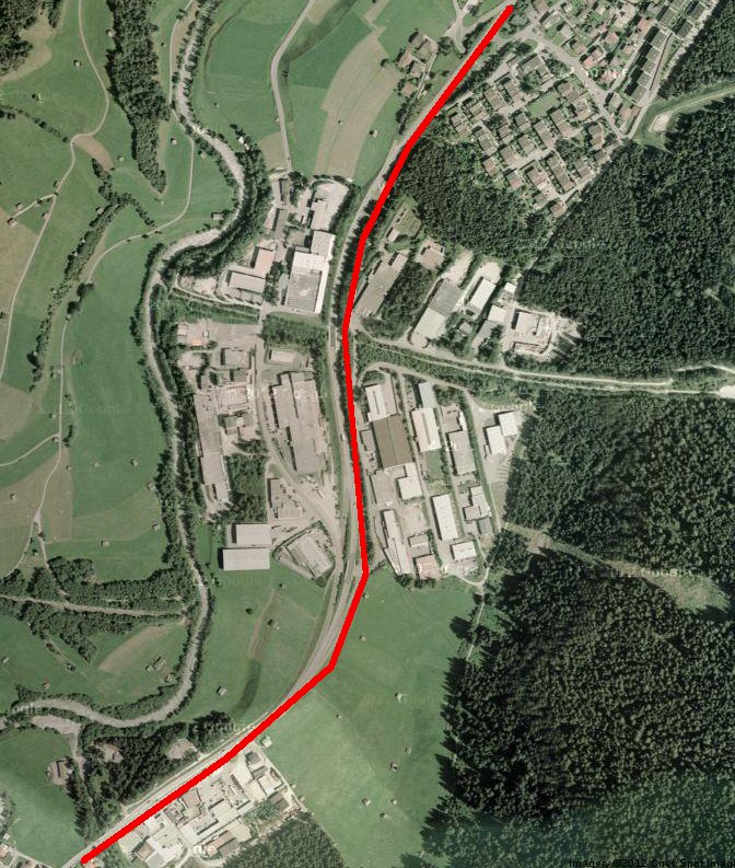 Danach einfach der Straße bis Medraz folgen, und am Ortseingang in einer S-Kurve auf die andere Talseite. Erstens, weil die Holzbrücke am Ortseingang von Medraz sicher nicht tramtauglich wäre (und gleichzeitig wohl erhaltenswert), und zweitens, um die recht dichte Besiedlung und darauffolgend das Industriegebiet zu erreichen. Hier könnte man auch durchaus an Güterverkehr denken würde ich sagen.