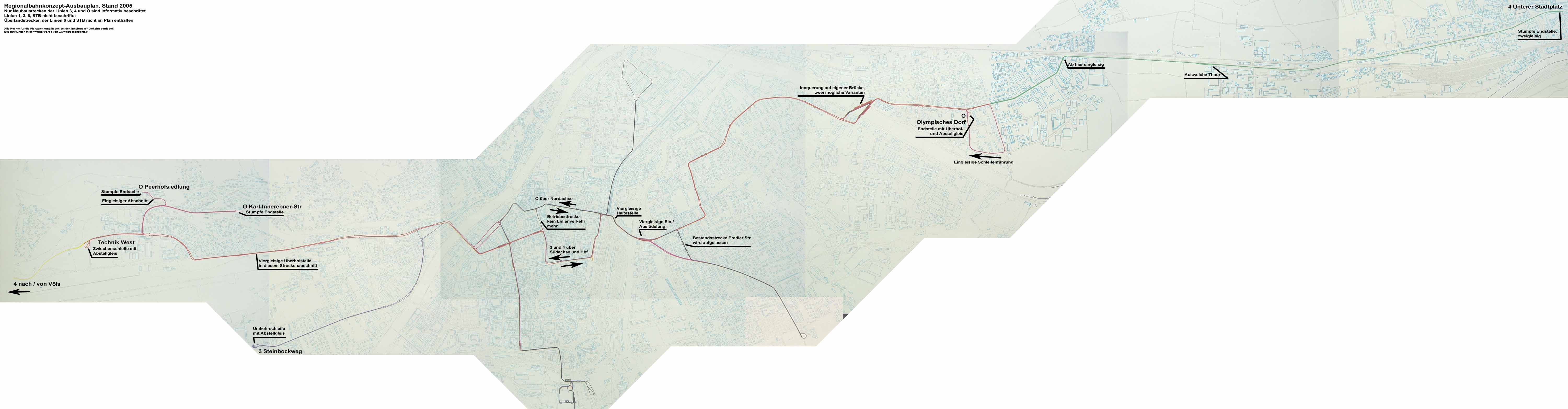 Mit der ebenfalls zweigleisigen Strecke durch die Schützenstraße Richtung S-Bahnhof und Hall sind das O-Dorf und Neu-Rum auf der zentralen Achse komplett erschlossen, eventuell würde im Südosten noch eine Stadtteilrund- oder Ringlinie als Ergänzung Sinn machen (die Linie T ist zumindest in ihrer derzeitigen Form ungeeignet).