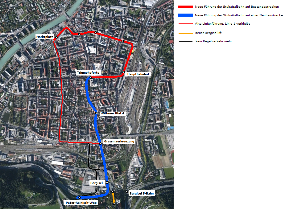 Um die schnellere Fahrzeit nach Fulpmes zu ermöglichen, ist auch die Direktführung der Züge von Bergisel zum Hauptbahnhof nötig (Bild 1). Diese Neubaustrecke würde auch zur Beschleunigung der 6er beitragen.