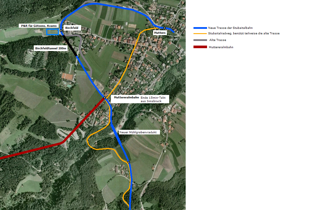 Hinter Mutters bis Kreith entstehen an der Bahn laufend kleinere Wohneinheiten. Eigentlich wünschenswert. Und hinter Kreith wäre auf den Wiesen, wieder die Analogie zur MOB, eine Trassierung bis 70 km/h denkbar. Anbindung Fulpmes und Weiterführung bis Neustift wäre folgerichtig das Zukunftsprojekt für die STB. Die Anbindung Axams' würde fast Doppelspurinseln bis Mutters erforderlich machen, deshalb erachte ich eine Mittelgebirgstram mehr als eigenständiges Erfordernis.
