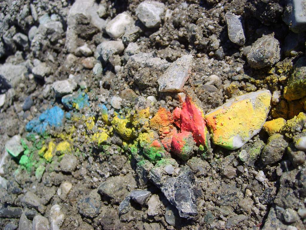 | Was ist hier zu sehen, |  aufgewühltes Erdreich vermischt mit Gleisschotter, schön drappiert mit versch. Markierungssprays