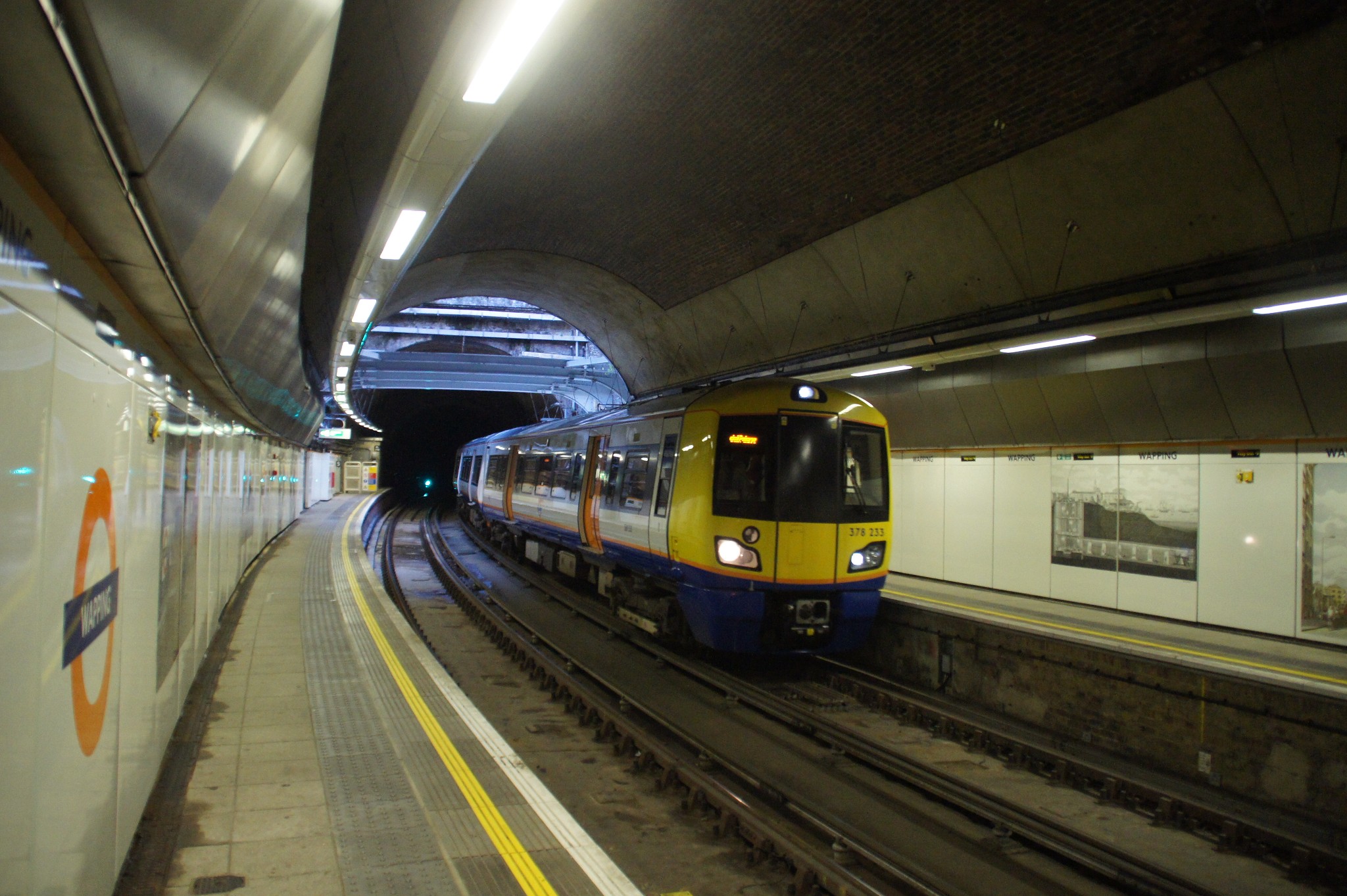 55. Zug der "Overground" im Bahnhof Wapping der früheren East London Line, die bis 2010 als Subsurface-Linie betrieben und nunmehr ins Regionalnetz durchgebunden und an beiden Streckenenden verlängert ist. Gut sichztbar die Öffnung in der Tunneldecke, über die die einstigen Dampfzüge Dampf ins Freie ablassen konnten.