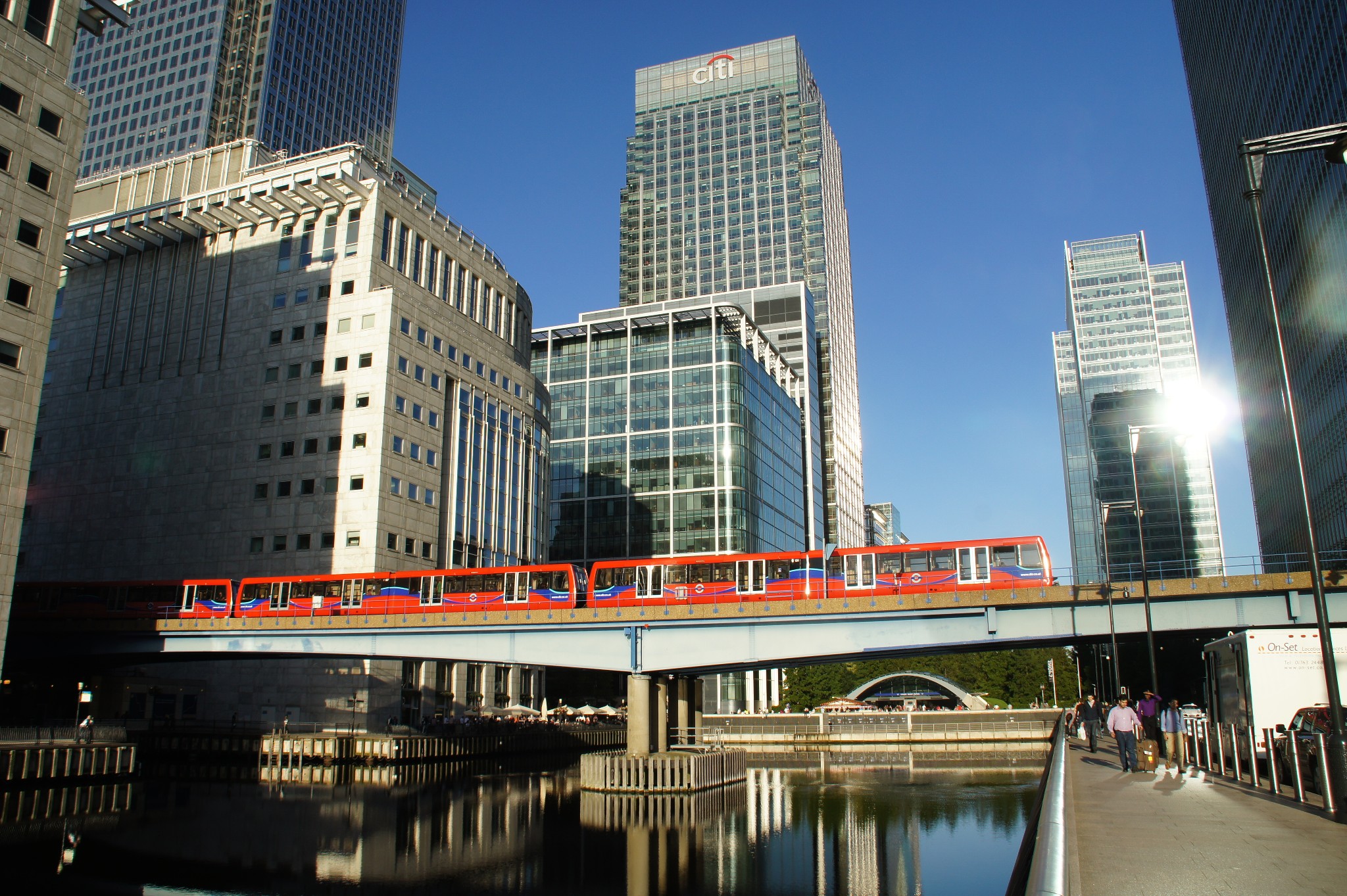 56. und 57. Erst im Jahr 1984 wurde mit dem Bau der Docklands Light Railway (DLR) begonnen, die zur Erschließung der Entwicklungsgebiete im ehemaligen Hafen eingerichtet wurde. Das 12 km lange Grundnetz ging 1987 in Betrieb und wurde seither kontinuierlich auf mittlerweile 4 Linien erweitert, die nächste Verlängerung folgt noch in diesem Jahr. Die Fotos zeigen die aufgeständerte Strecke bei der Station Canary Wharf.