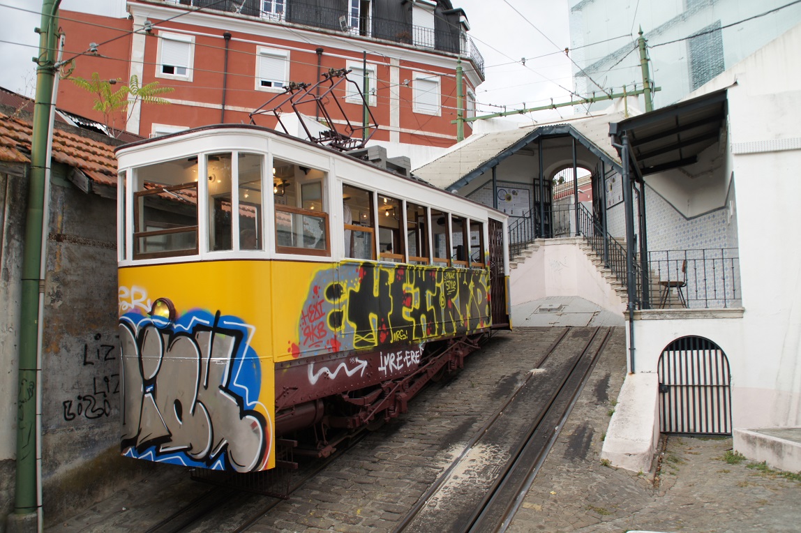 Lissabon ist eine sehr hügelige Stadt mit sehr starken Steigungen, die zum Teil durch Aufzüge und Standseilbahnen erschlossen werden. Leider kann ich vom berühmten freistehenden Senkrechtaufzug Elevador da Santa Justa kein Foto zeigen, weil dieser derzeit vollständig durch Bauplanen zwecks Restaurierung eingehüllt ist. Deshalb widmen wir uns im nächsten Kapitel gleich den drei Standseilbahnen, die alle 3 durch steile Altstadtgassen führen. Dadurch sind sie natürlich auch frei zugänglich, was man den ursprünglich traditionell gelb-weiß lackierten Fahrzeugen leider ansieht...